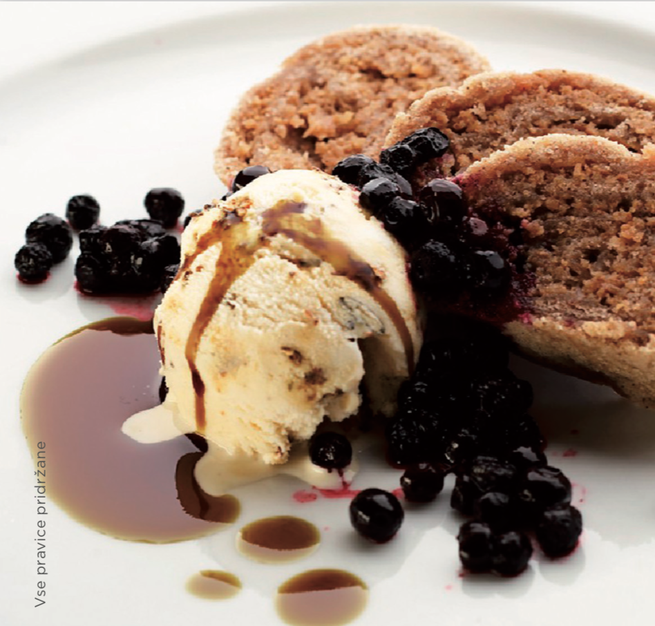 - Ajdovi štruklji z orehovim nadevom in borovnicami ter sladoled z bučnim oljem