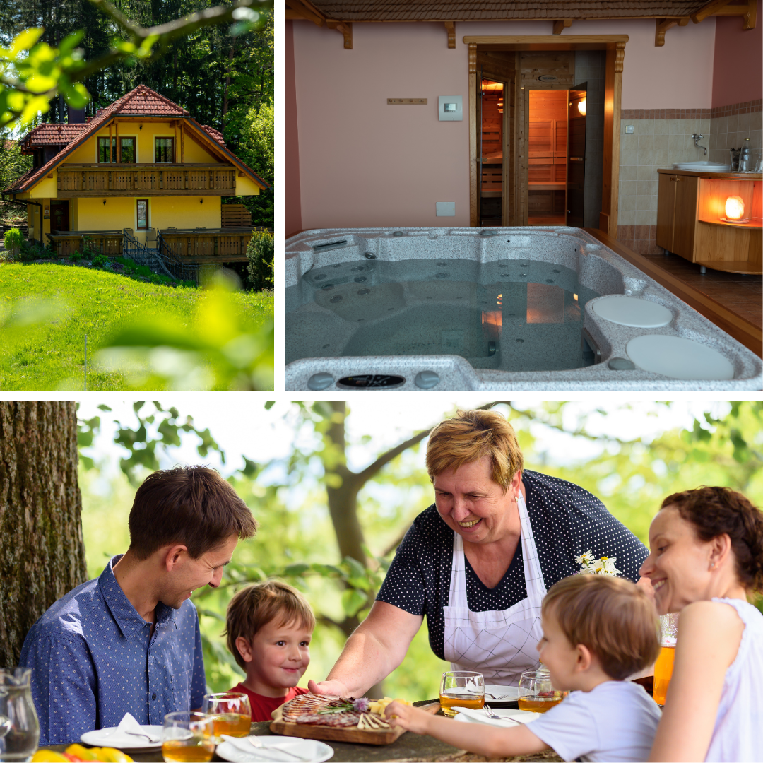 - Nočitev z zajtrkom ter 3 urni individualni zakup hišnega wellnessa (finska in infra savna, masažni bazen, rjuhe, domač jabolčni sok in čaji). Za 2 osebi.